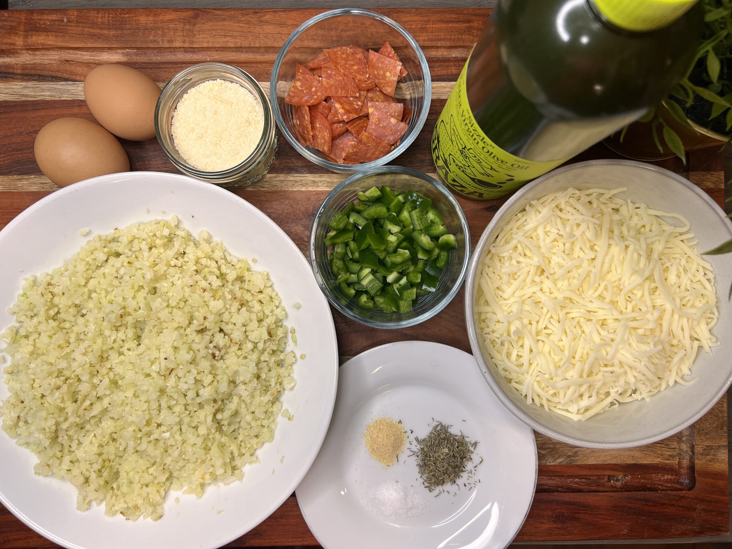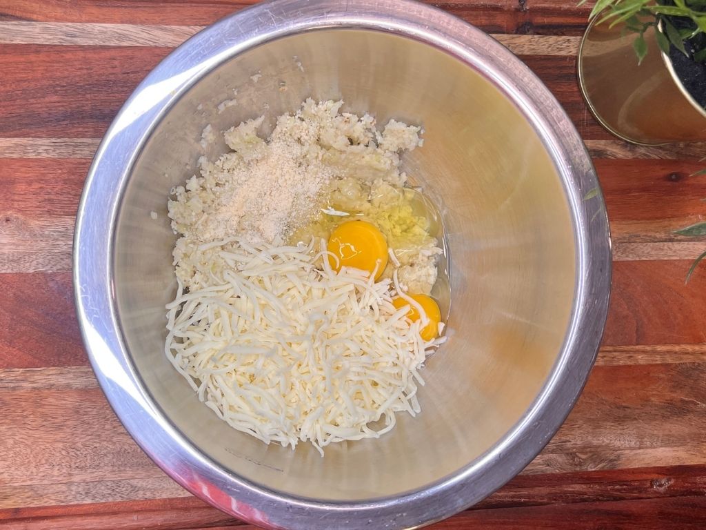 - Step 3: In a large bowl, combine the squeezed cauliflower, eggs, mozzarella, parmesan, Italian seasoning, garlic powder, and salt. Stir until fully incorporated.