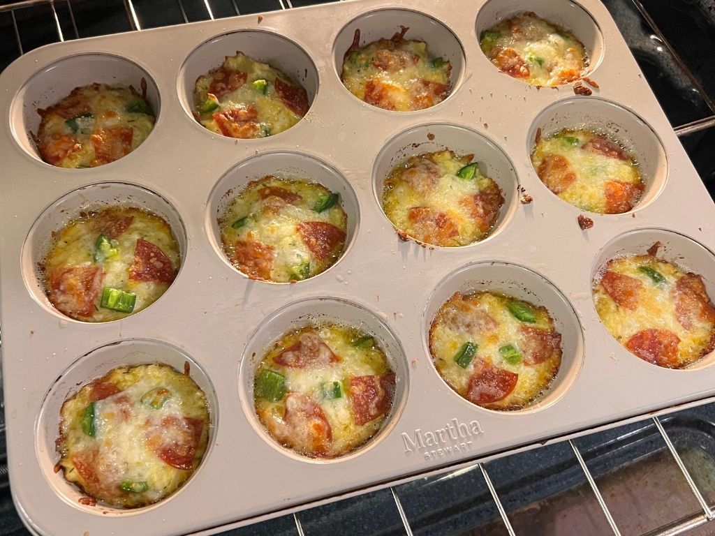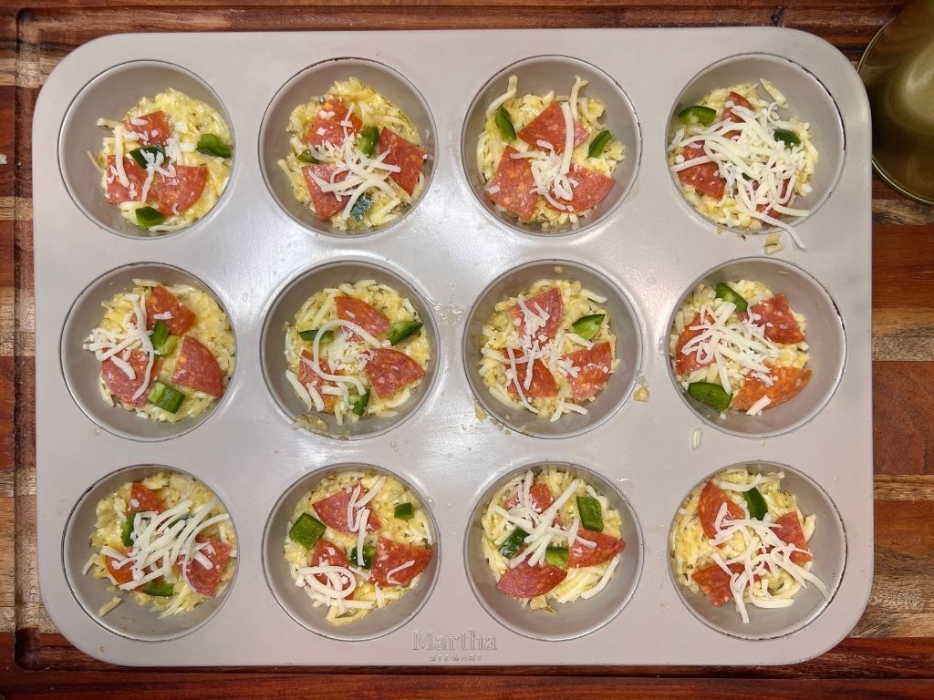 - Generously grease a metal muffin tin. Fill each cup about ¾ full and press firmly. Top with mozzarella cheese, jalapenos and pepperoni.